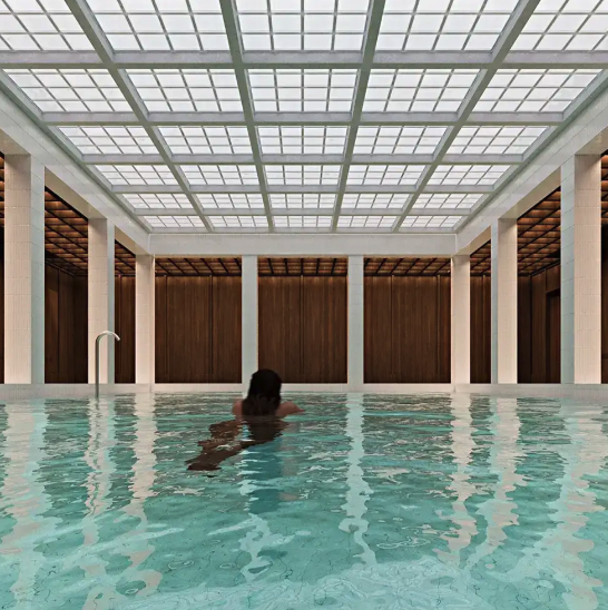 - prywatną strefę rekreacji — m.in. basen inspirowany rzymskimi łaźniami, z kolumnadą.