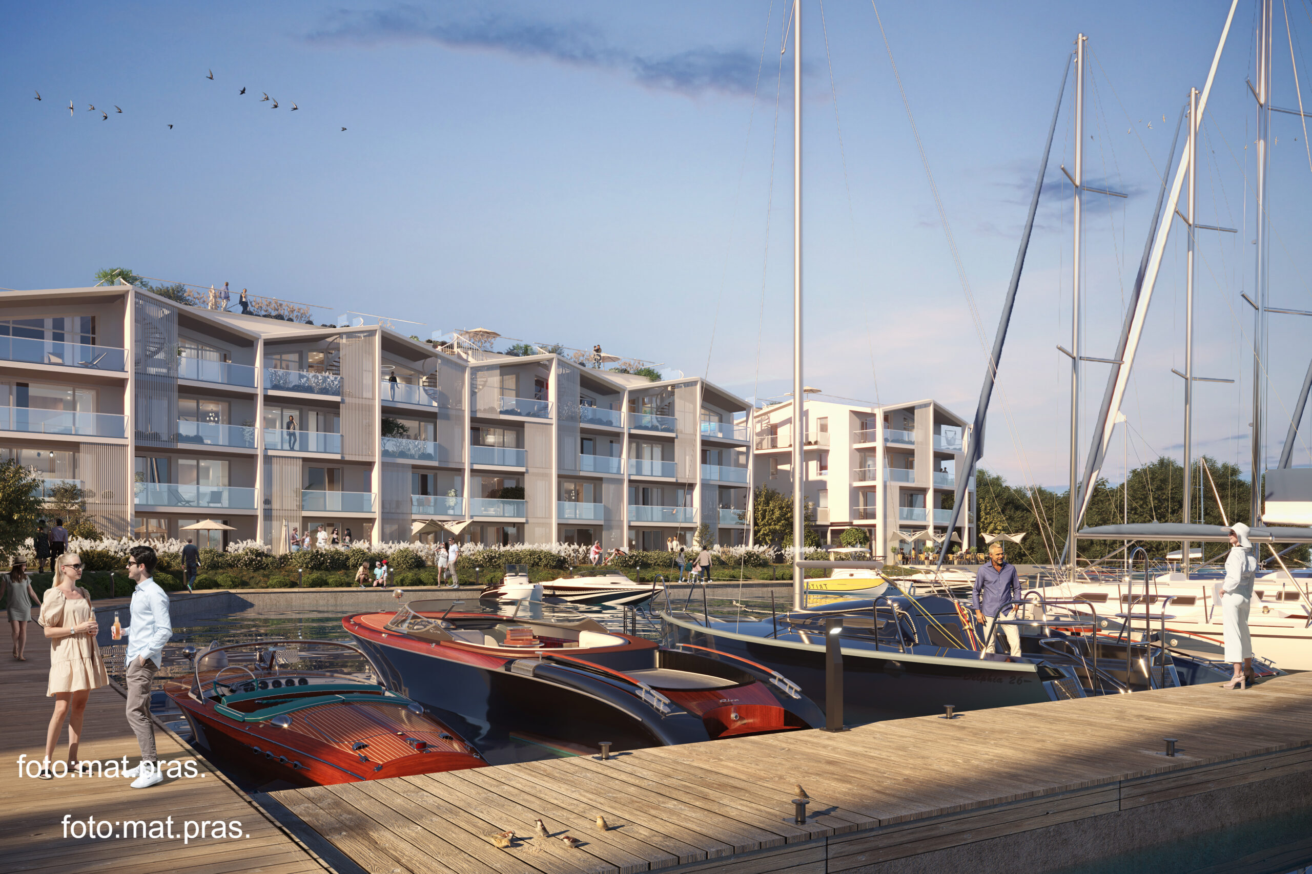 Urokliwy teren całego kompleksu wypełni starannie zaprojektowana zieleń, a komfortu dopełnią restauracja i sklep żeglarski.
